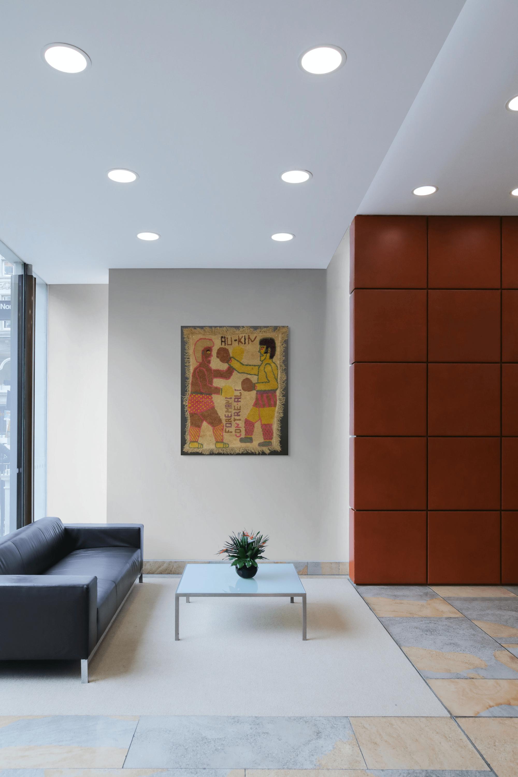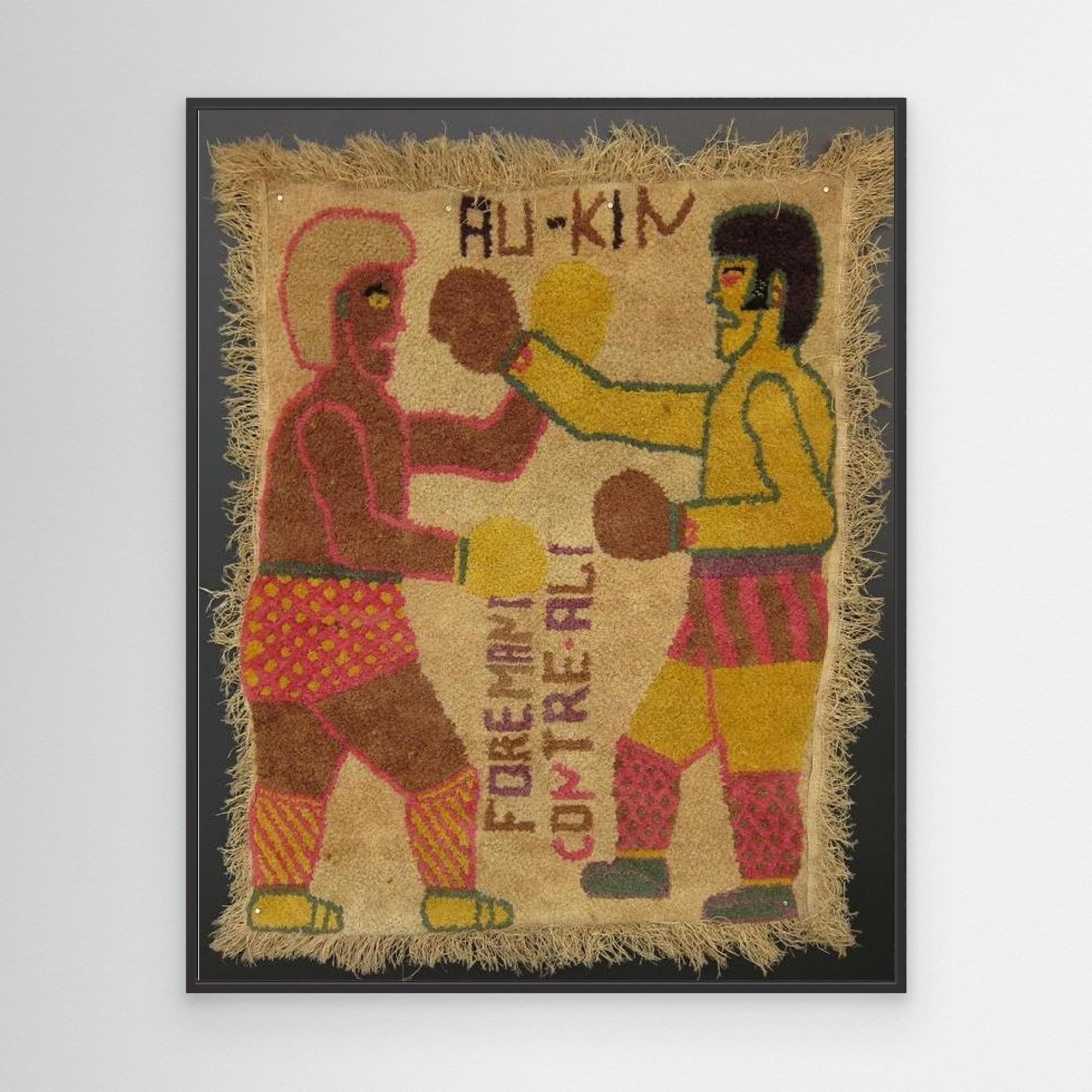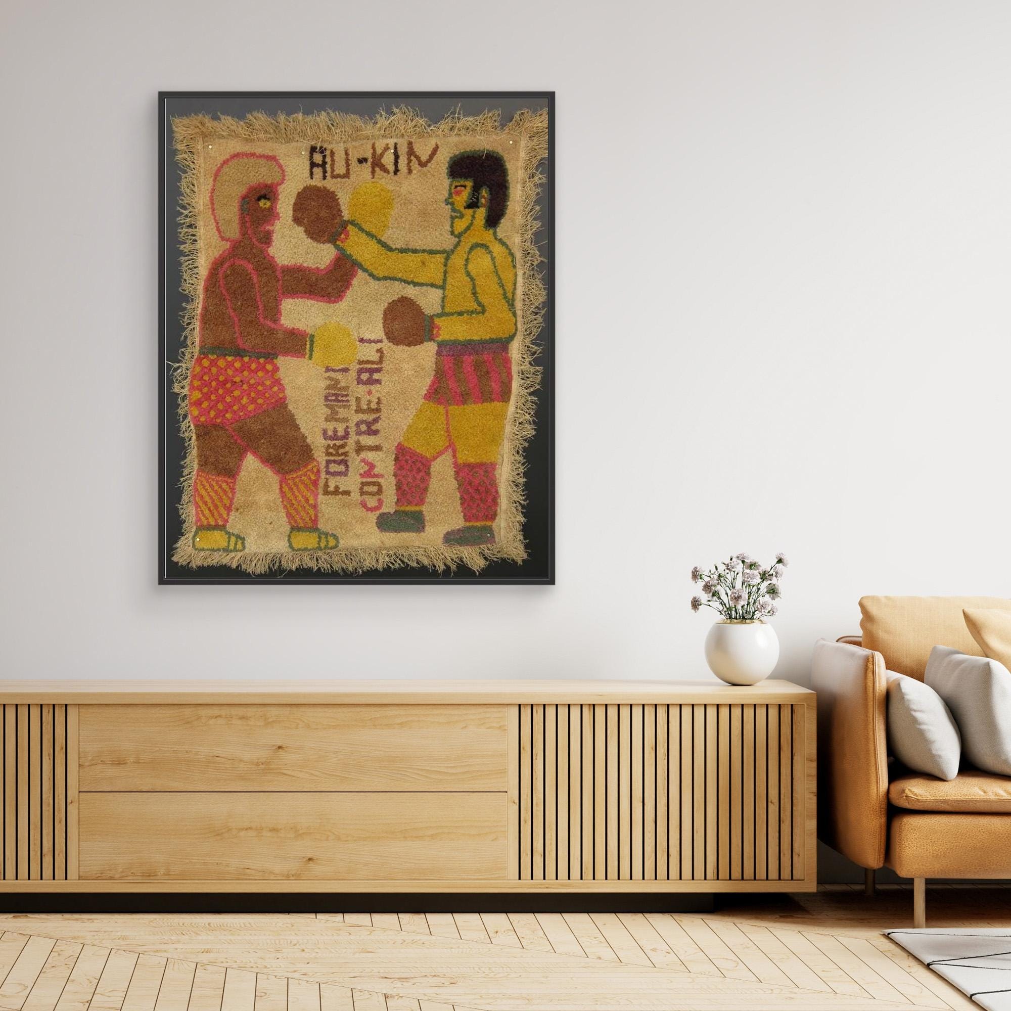 This pieces originates from a hand-made textile depicting the iconic boxing scene in Kinshasa 1974 between Muhammad Ali and George Foreman. Exceptional piece from the Kuba People in Congo, RDC. Normally they're with geomatric patterns, woven by man and embroided by women. Raffia. Exceptional and rare piece.