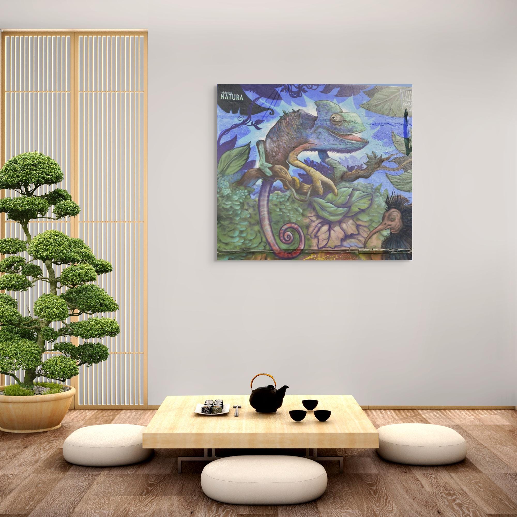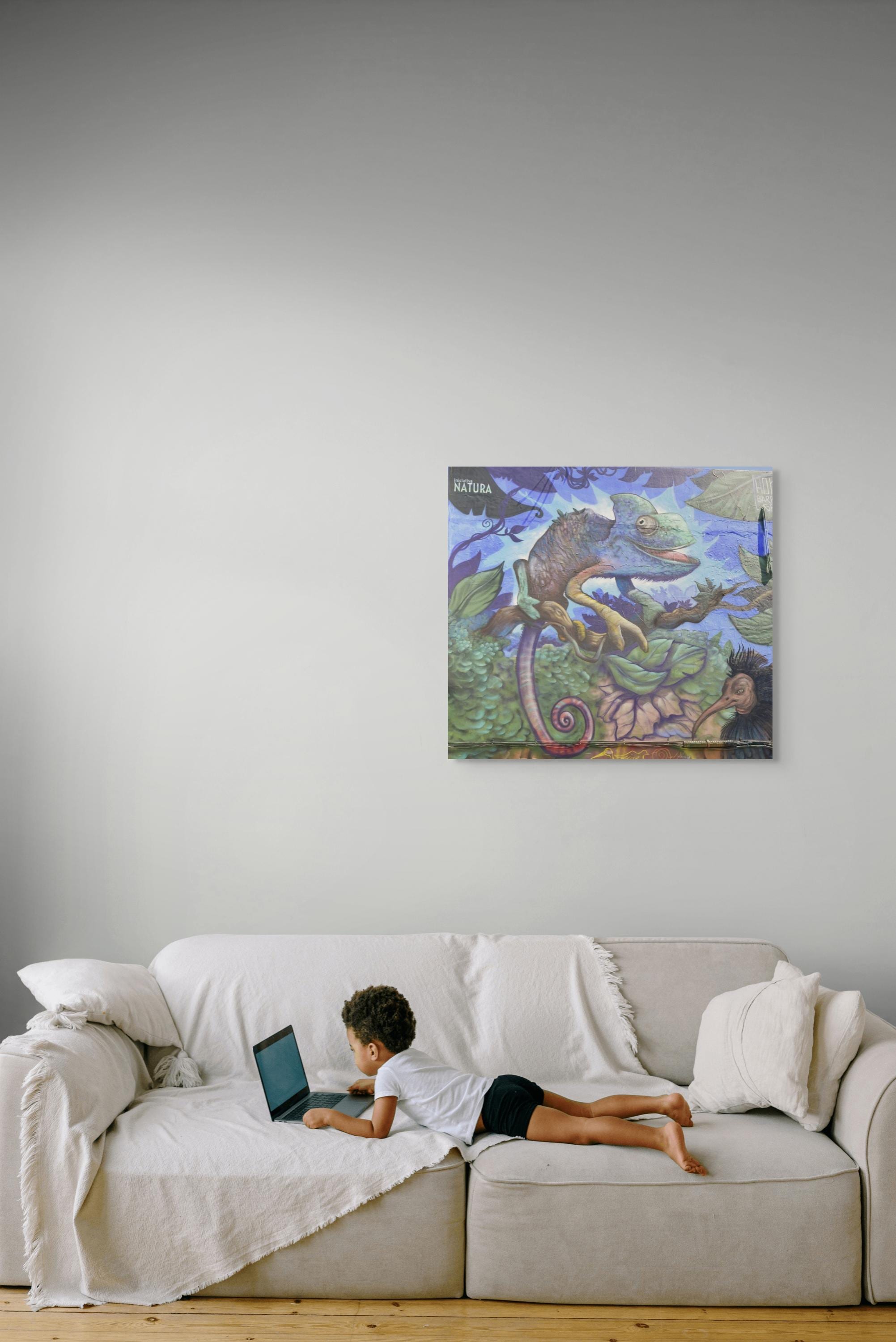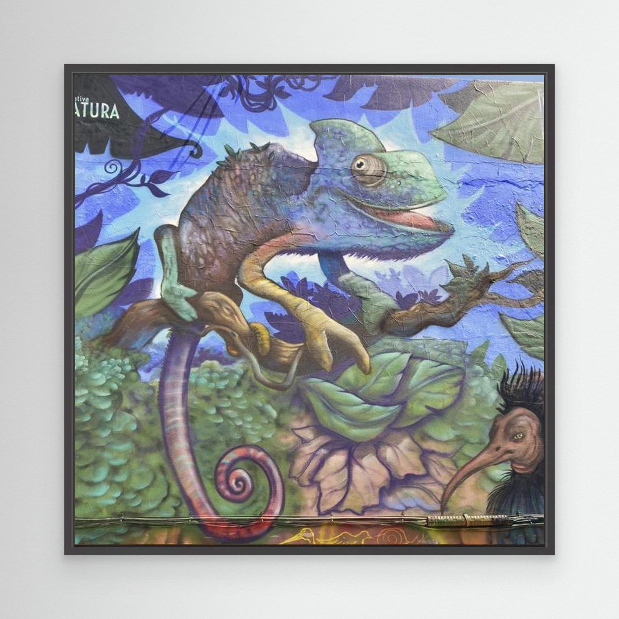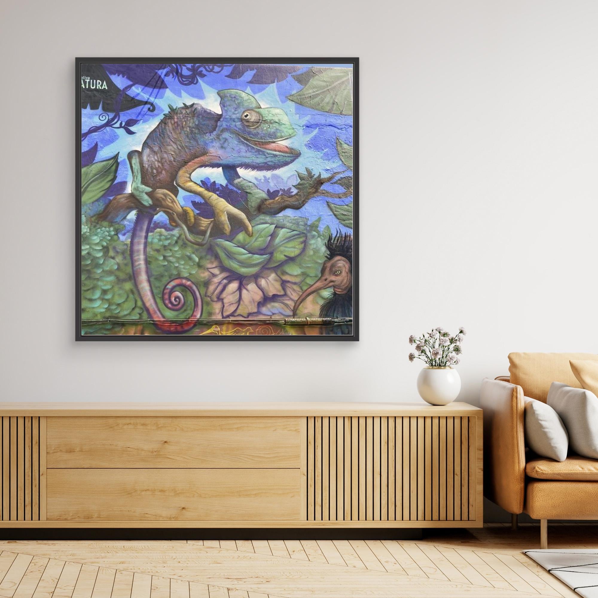 • Poly-cotton blend canvas with a matte/satin finish. Scratch, crack, and warp resistant. • Vibrant, long-lasting colors with water-based HP Latex inks and UV protection. • Solid wooden frame from renewable sources, 3.2 cm deep. “Professionally printed canvas, produced close to the buyer when possible and shipped with tracked courier delivery. Bring vibrant jungle energy into your home with this high-resolution artwork of a colorful chameleon painted on a urban wall. Perfect for kid's rooms,creative studios, eclectic interiors, and anyonewho loves bold street art