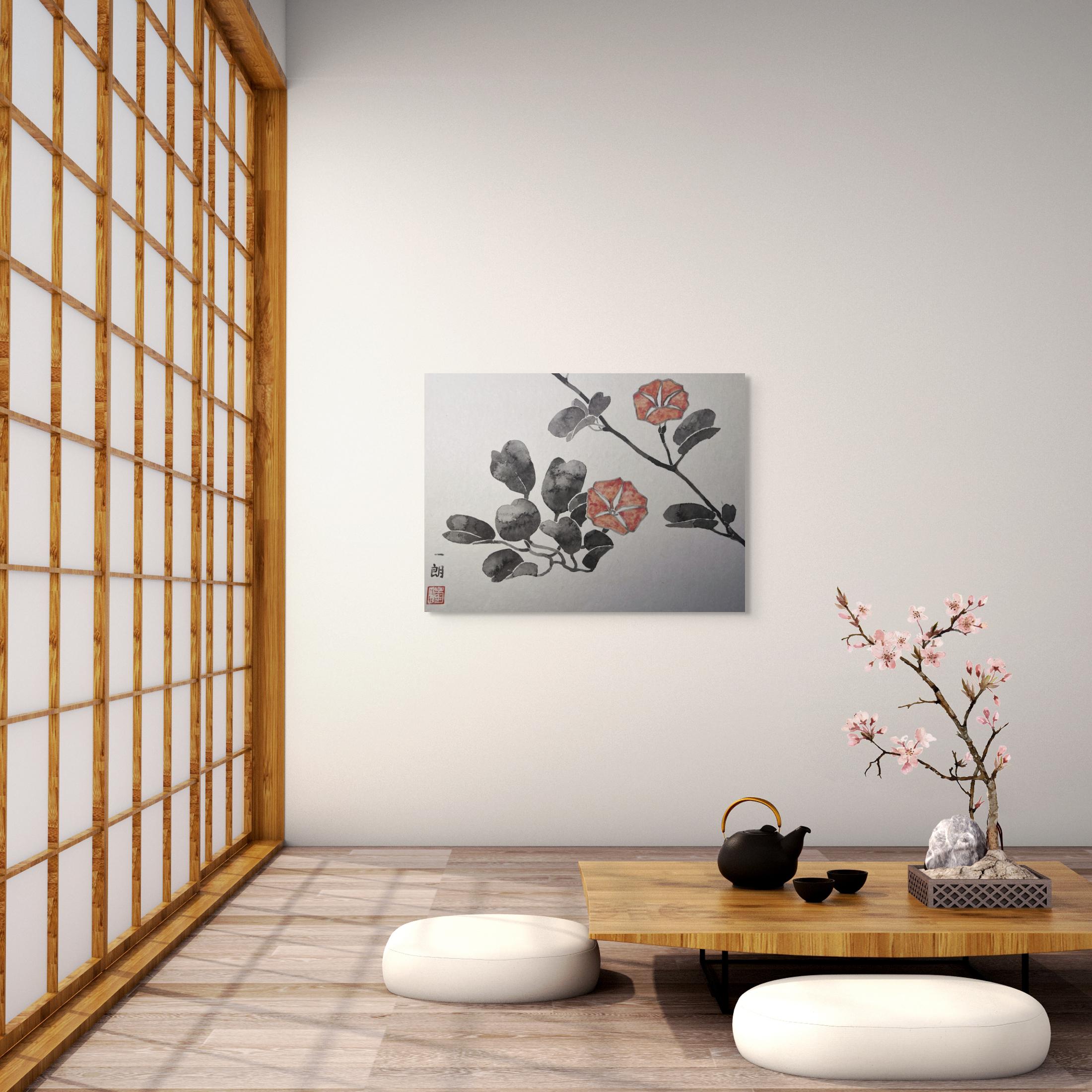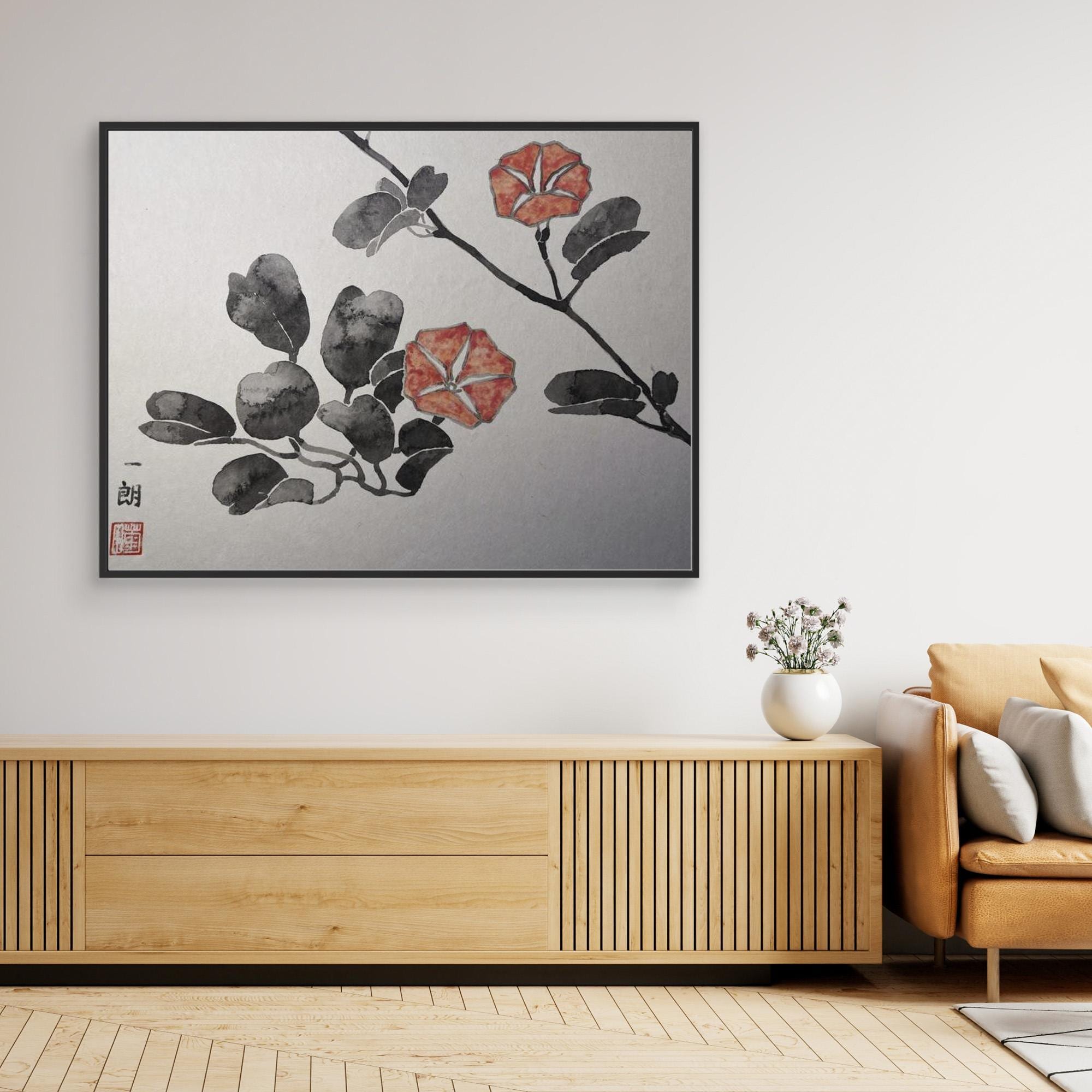 A subtle Japanese drawing with red flower detail - a perfect balance for simplicity and elegance. Ideal for Japandi, Wabi - Sabi and zen inspired interiors. Made by Ishiro Kikuta.
