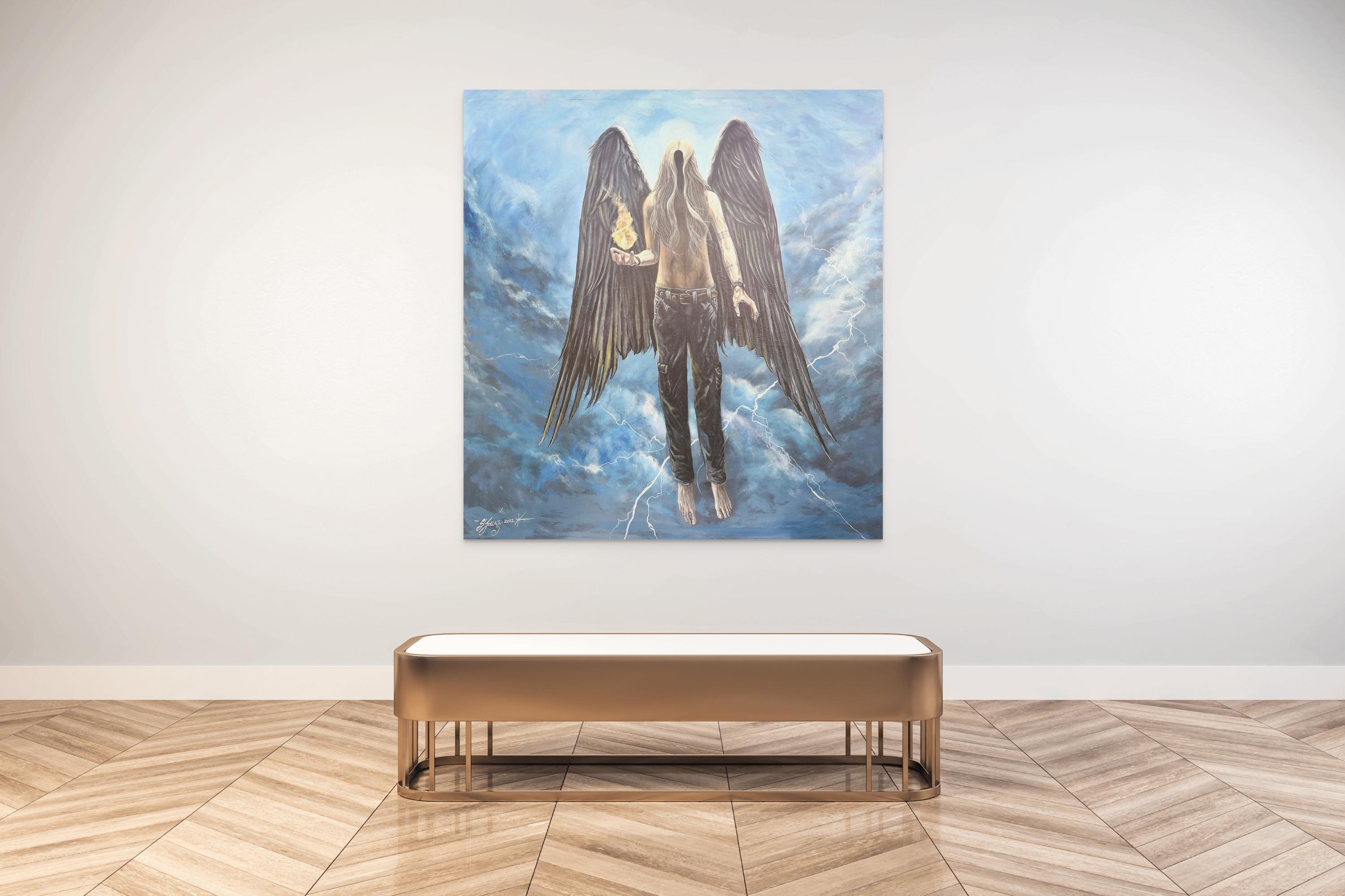This powerful figurative artwork depicts a winged figure suspended between earth and sky, holding a small flame in an open hand. The painting explores themes of inner strength, transformation, vulnerability, and resilience — the fragile balance between darkness and light.