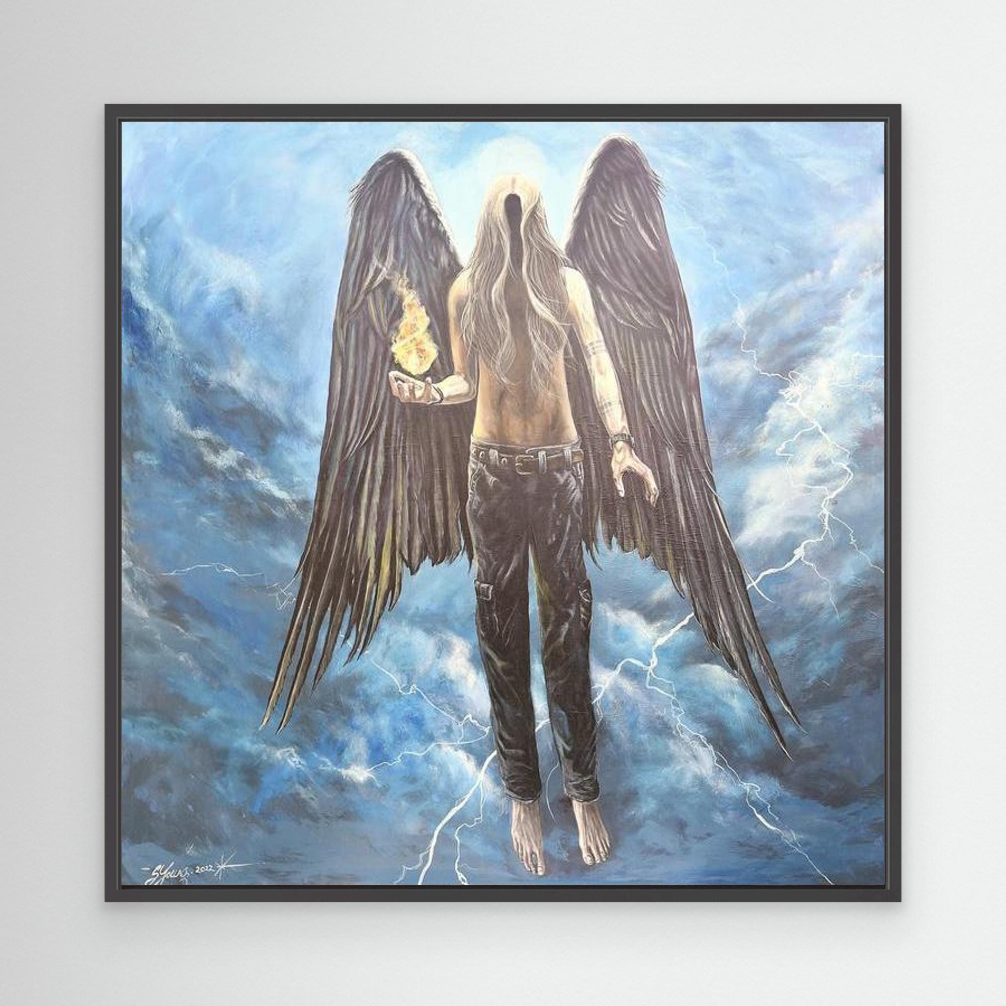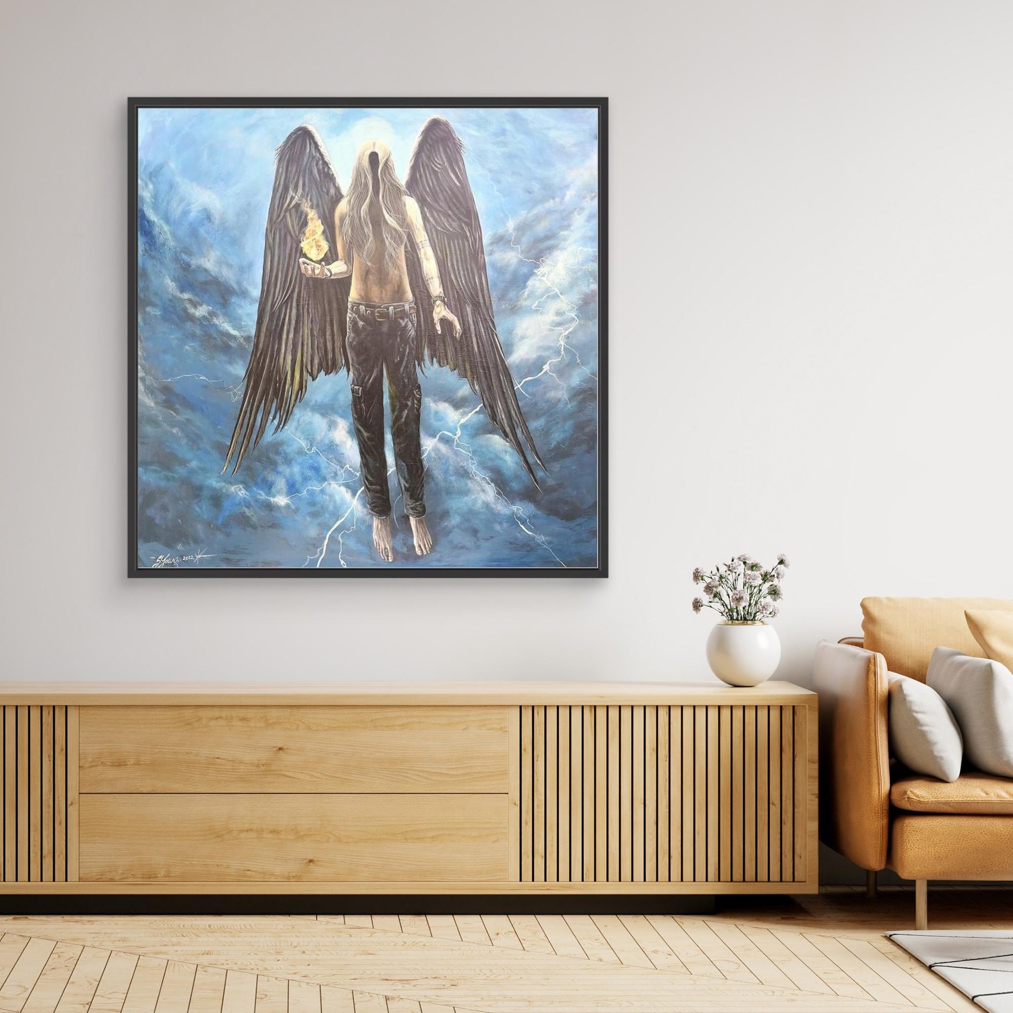 Rendered in expressive brushwork and dramatic contrasts, the wings dominate the composition, symbolizing protection, freedom, and burden at once. Lightning and clouds surround the figure, reinforcing a sense of tension and transcendence.