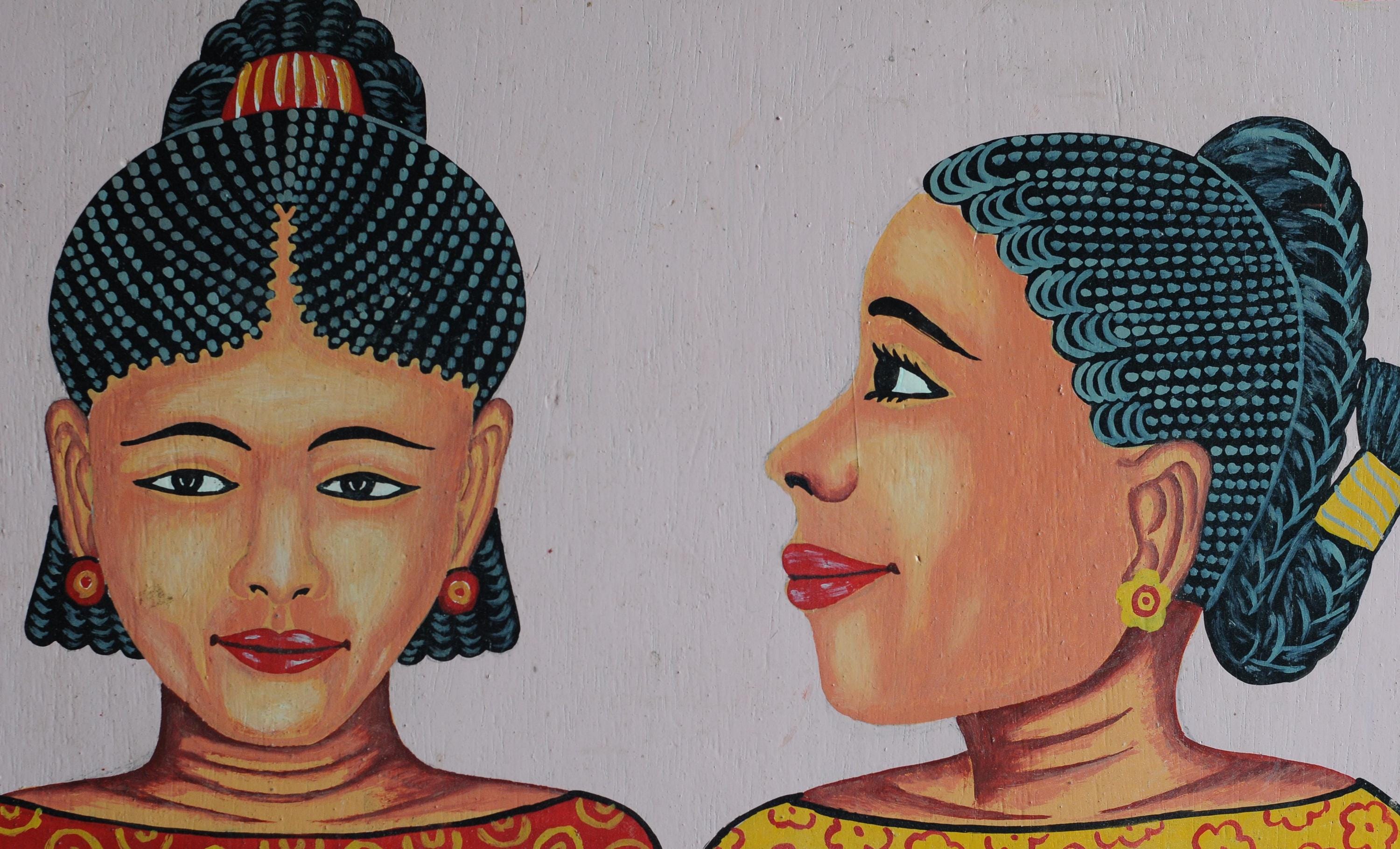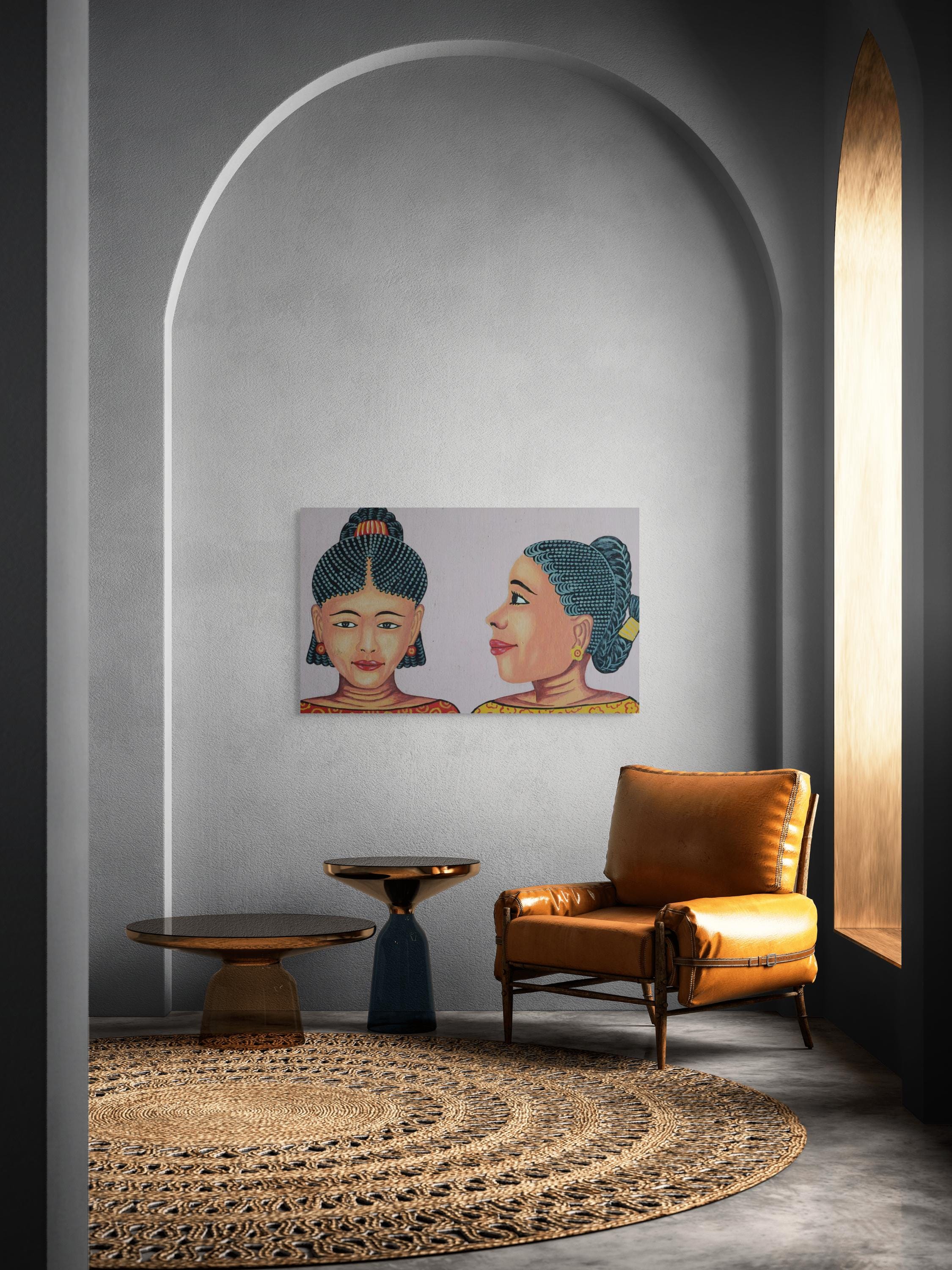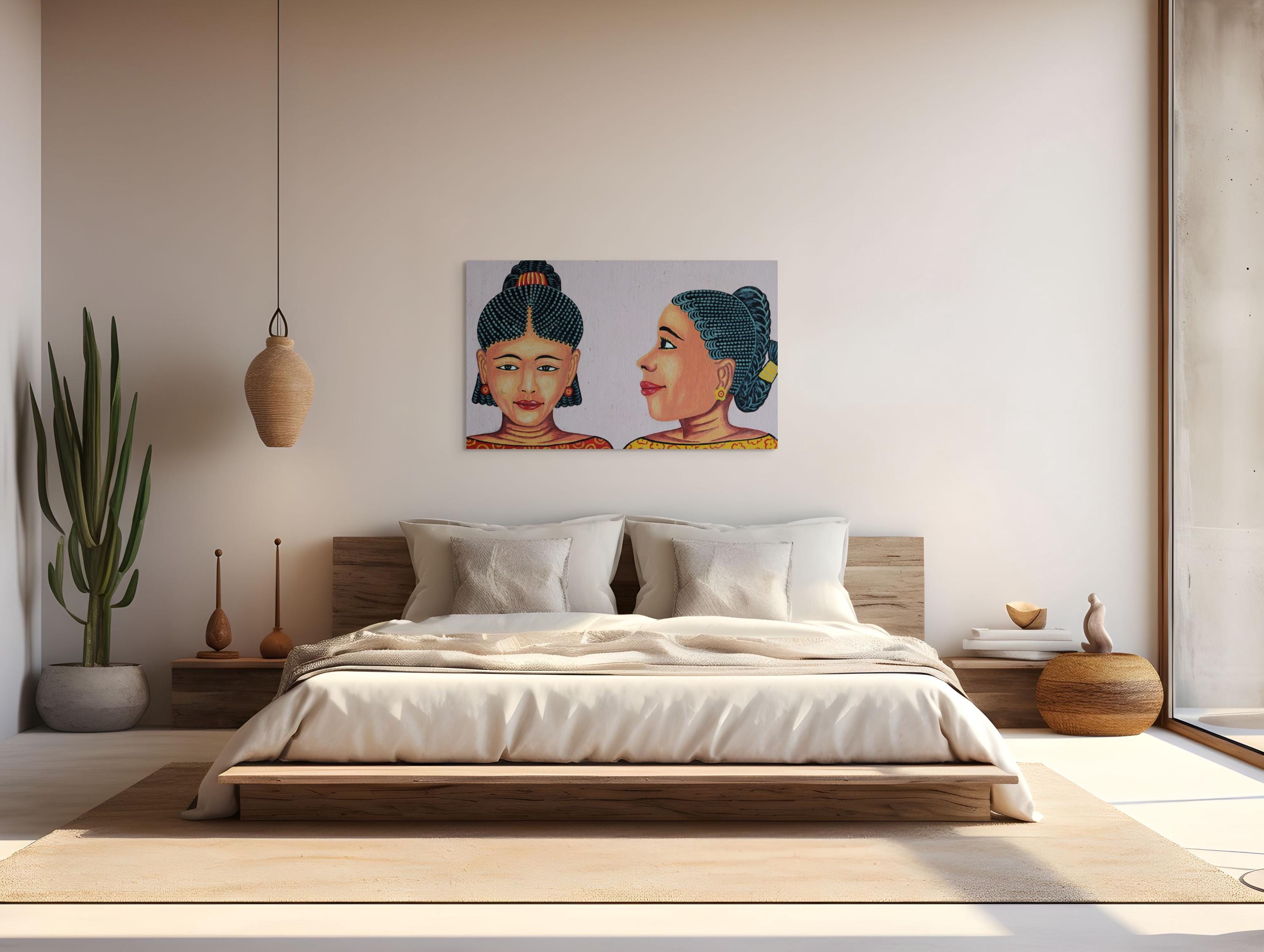This vibrant double portrait celebrates the bold graphic language of traditional salon signage. The strong lines, stylised braids and expressive faces create a striking visual statement that works beautifully in contemporary interiors.
