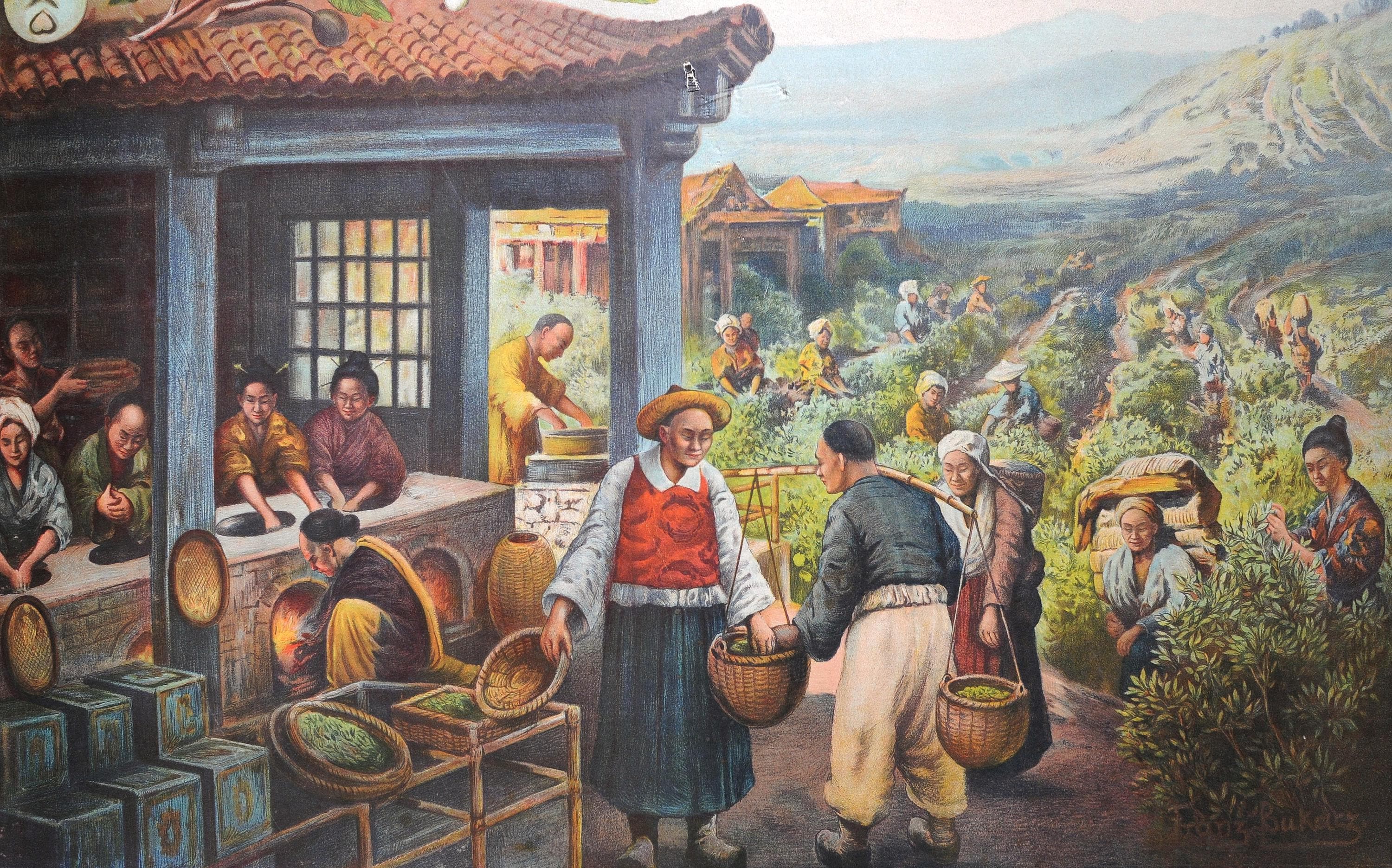 A vintage educational school chart illustrating the production of tea (Thea viridis), depicting cultivation, harvesting and traditional processing methods.
