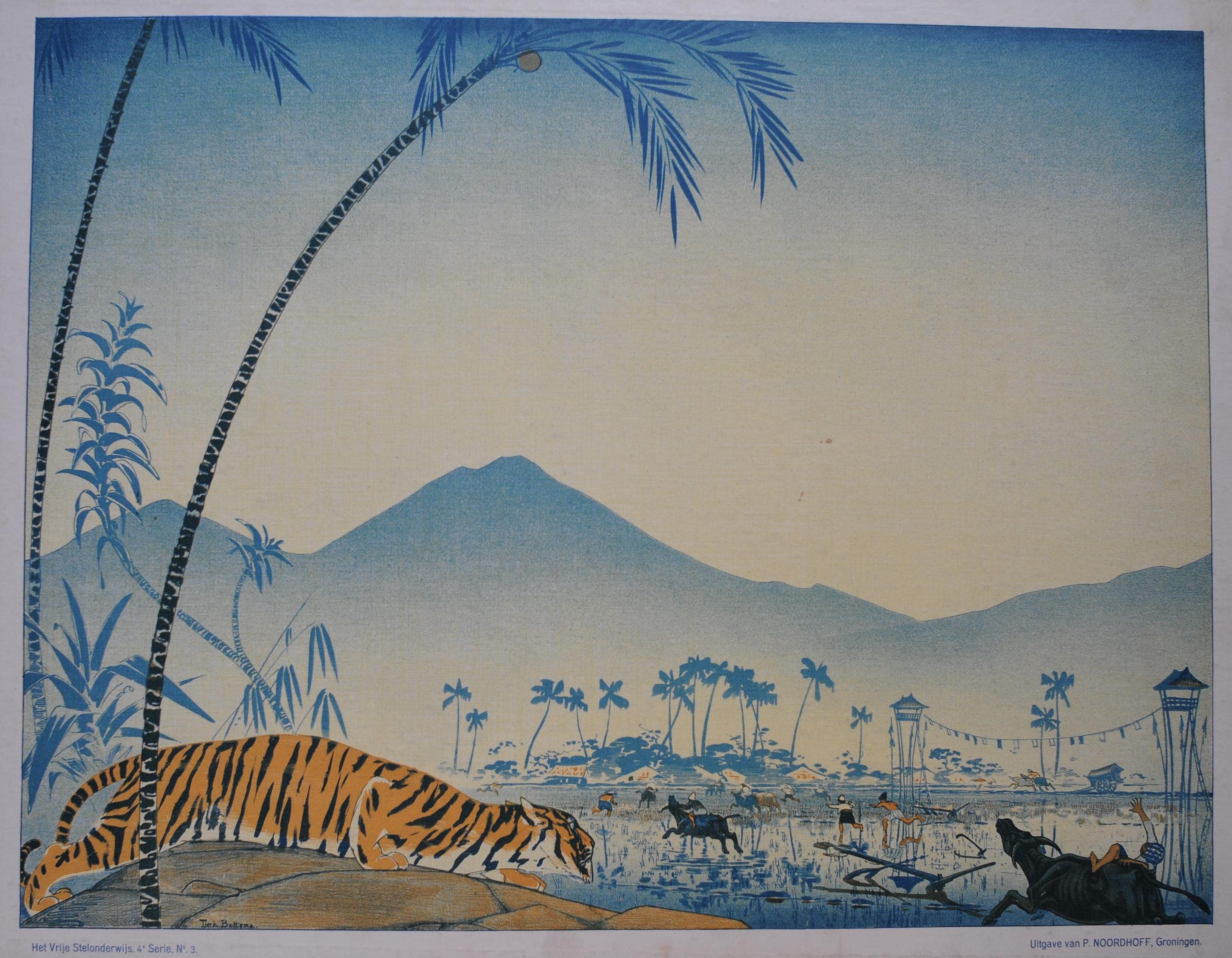 Vintage school illustration by Dutch artist Tjerk Bottema, depicting a tiger watching over rice fields in Indonesia. Originally created for educational wall charts, this striking composition combines soft blue landscapes with bold wildlife imagery, making it a unique statement piece for vintage and eclectic interiors. 40X30"