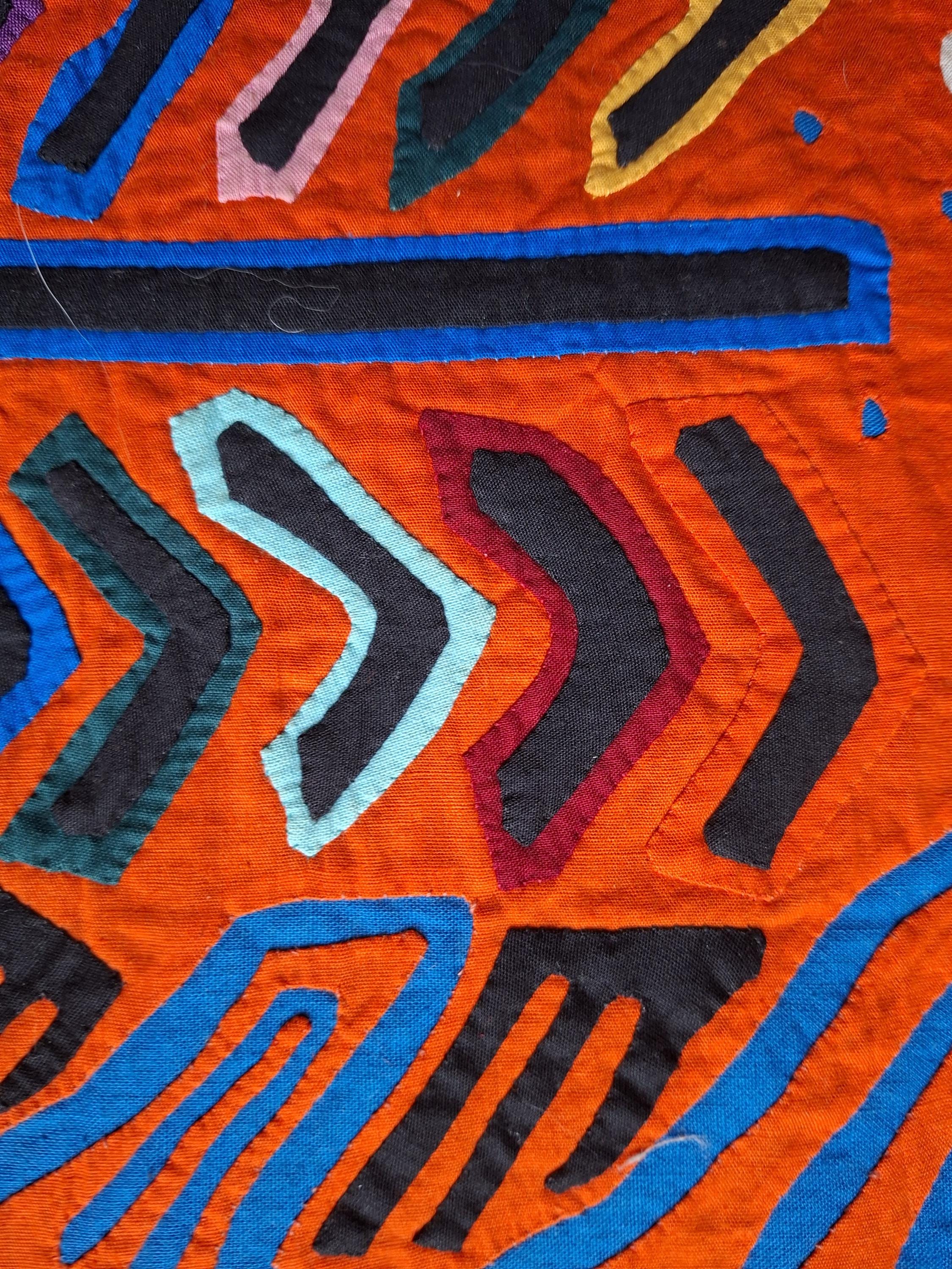 One of five curated mola textile panels from a small private collection. Each piece shows the beautiful geometric reverse appliqué technique of the Kuna / Guna people of Panama.