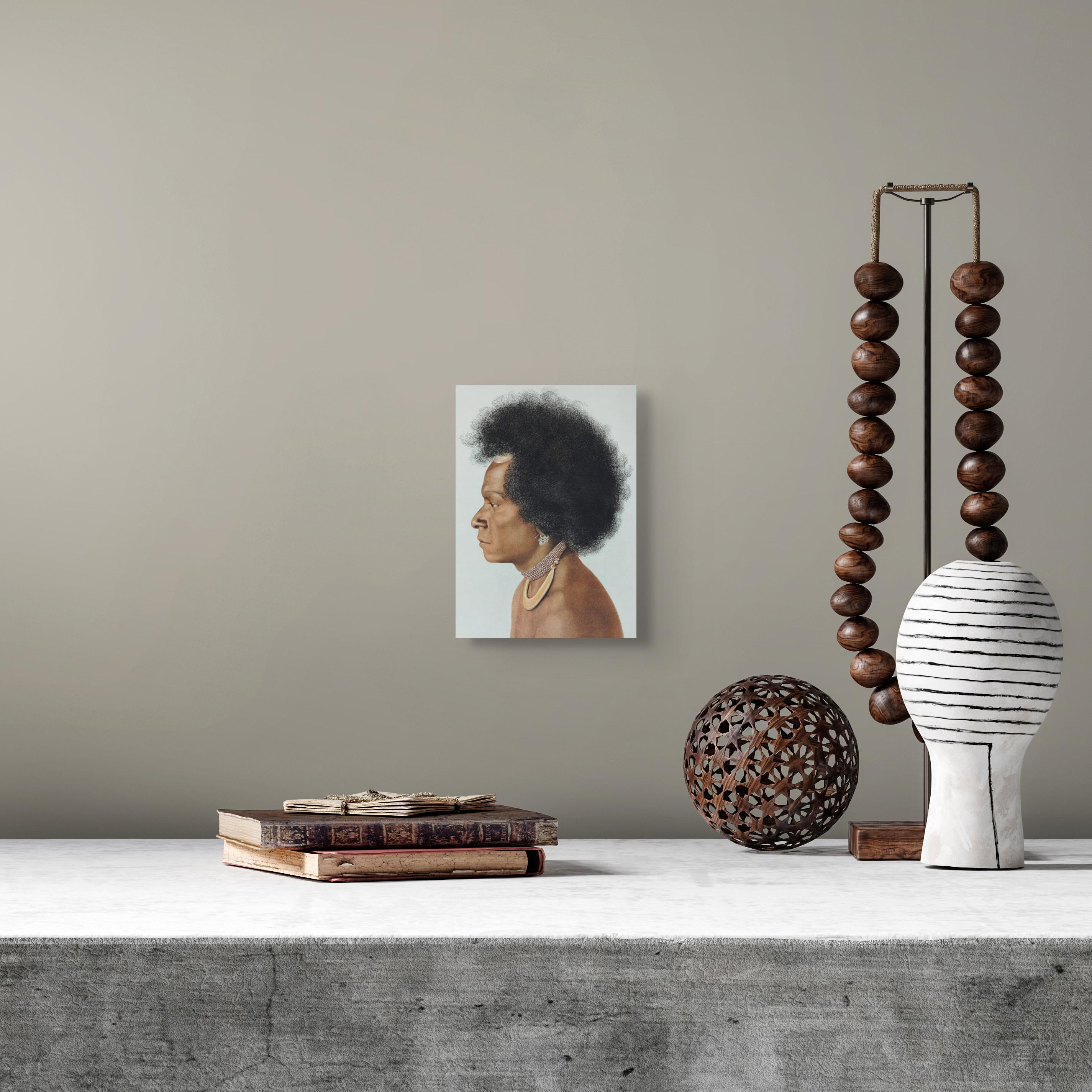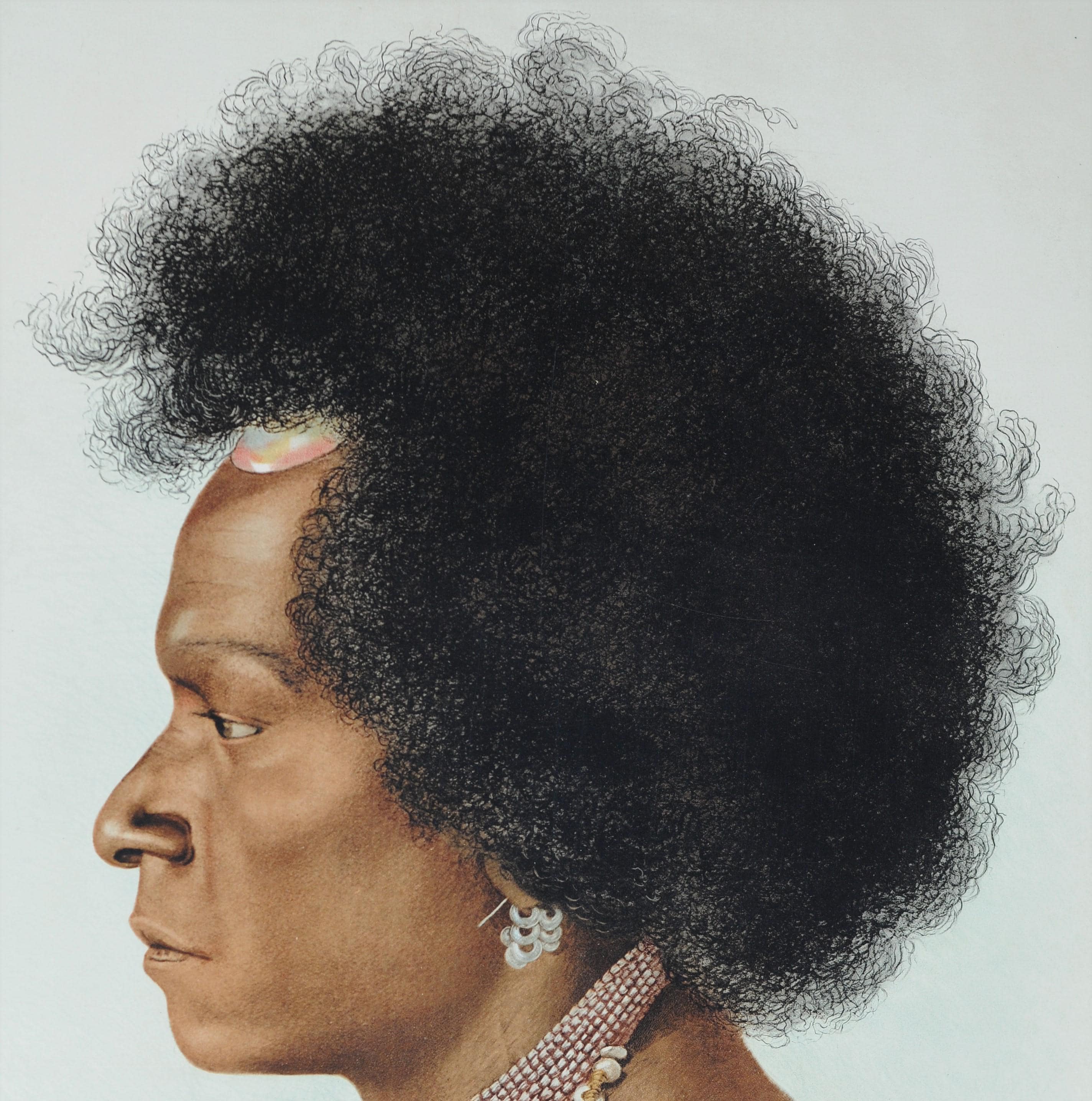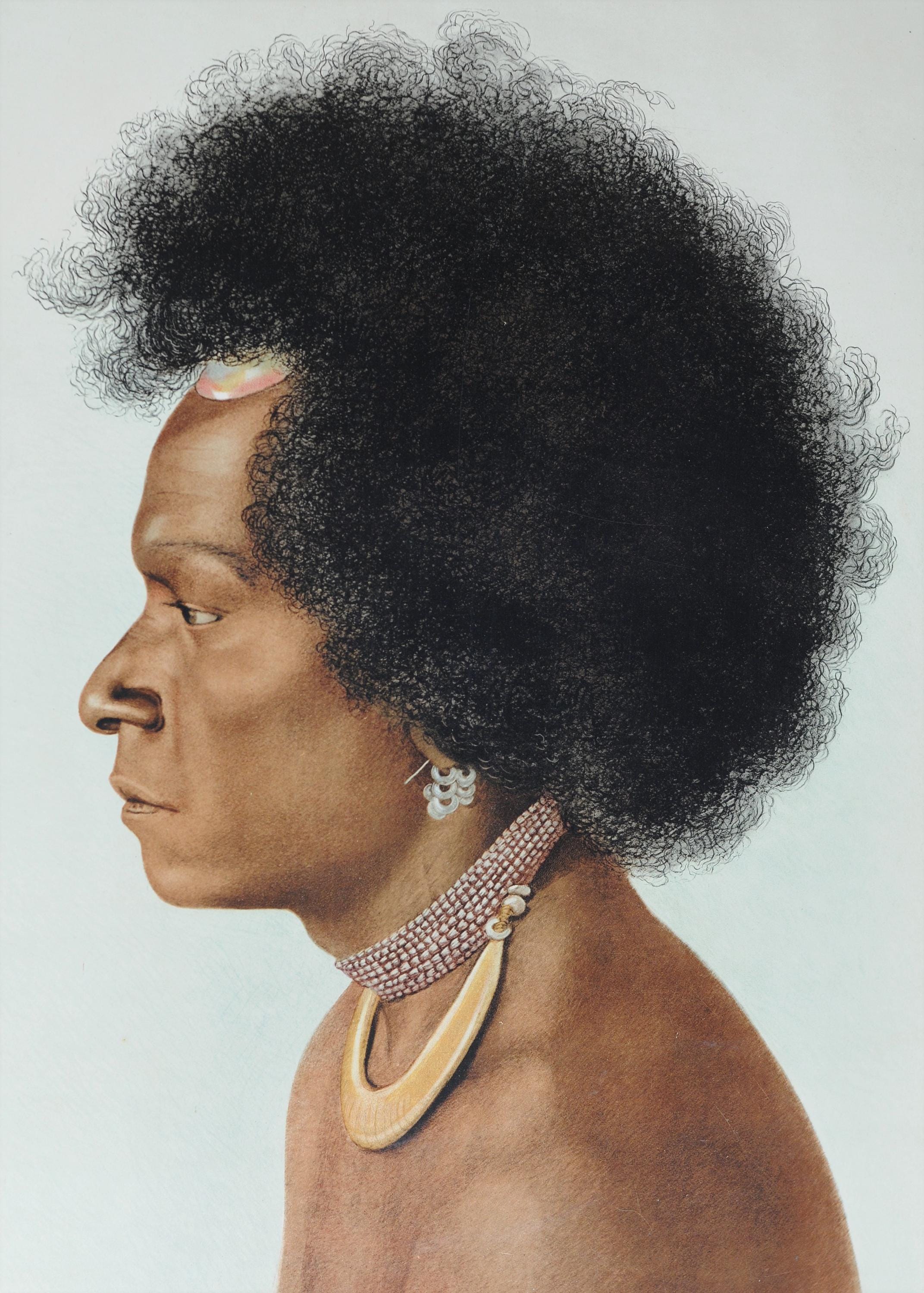 This plate depicts a Melanesian profile portrait and is printed with multilingual captions (French, German and English). The image is based on photographic documentation and rendered in a highly detailed academic illustration style.