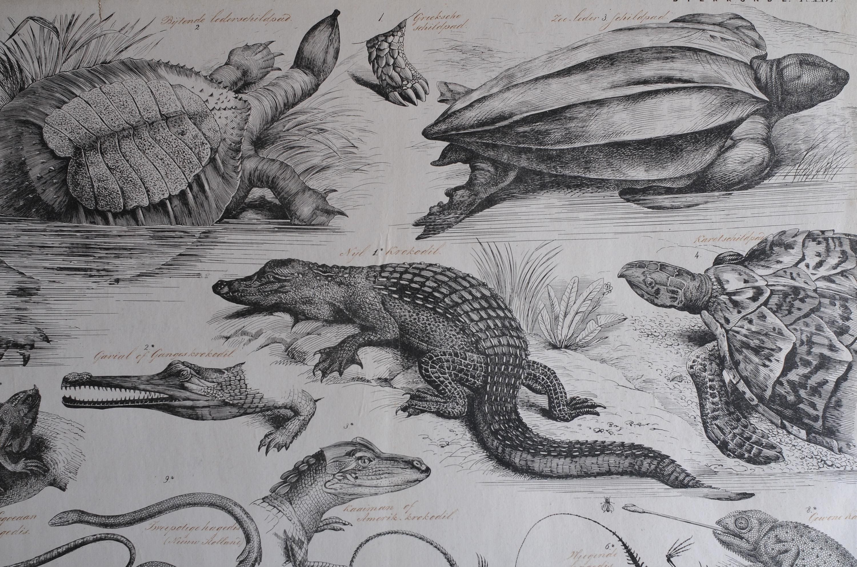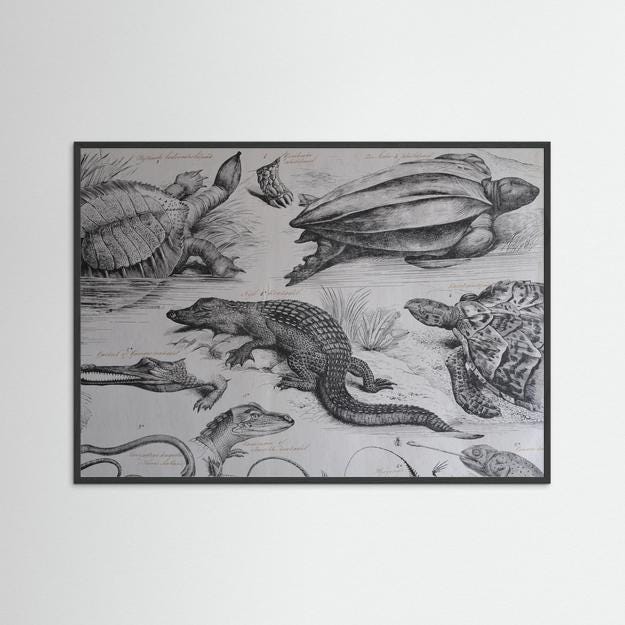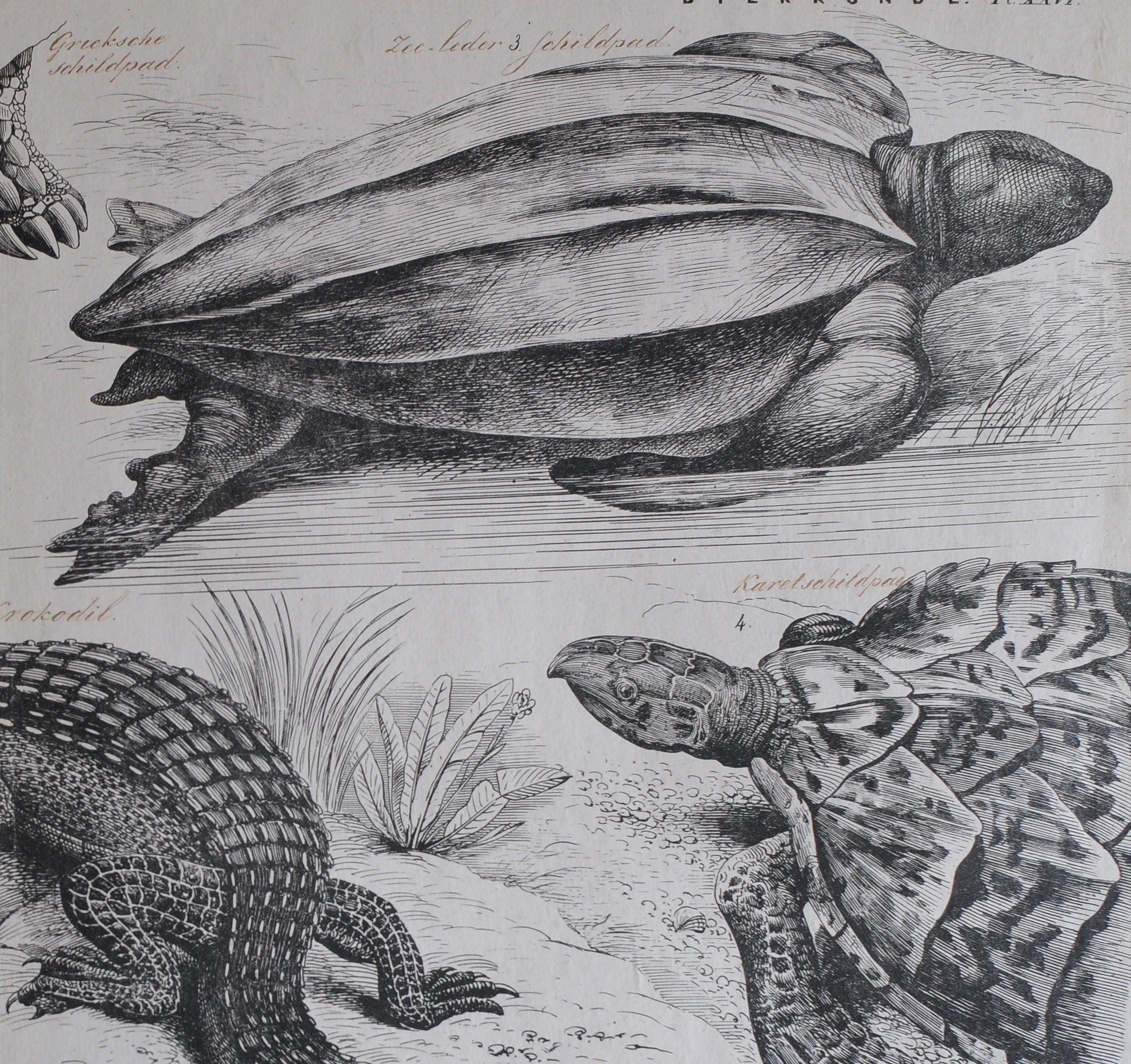 A beautifully detailed vintage zoology chart featuring turtles, originally created in the 19th century. This scientific illustration captures the elegance and precision of early natural history studies, making it a timeless piece for any interior. Combine with other natural history prints.